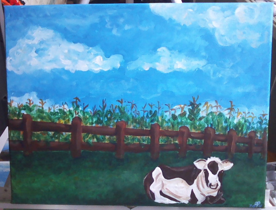 Earlier I posted the drawing for this painting, and now, here is the painting! This was done as a custom order and a trade with a friend. She wanted the colors of the sky, fence, and grass to be those of a painting from a Paint and Sip type of class project that she couldn’t attend. She added the corn and the cow. This is 11×14 in acrylics.