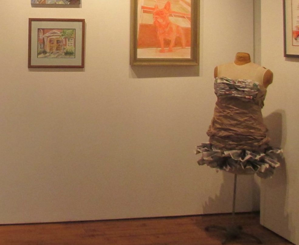 This dress was created for a local art show about the history of the building, now turned into artist studios, but once a shirt factory. My grandmother worked in this building a long time ago, so it holds some special meaning to me. I chose recycled materials, and created this dress out of brown packing paper and newspaper. The dress was created on a very old dress form that my grandmother found at a garage sale. This is currently on exhibit at The Shirt Factory Gallery until September 27, 2014.
