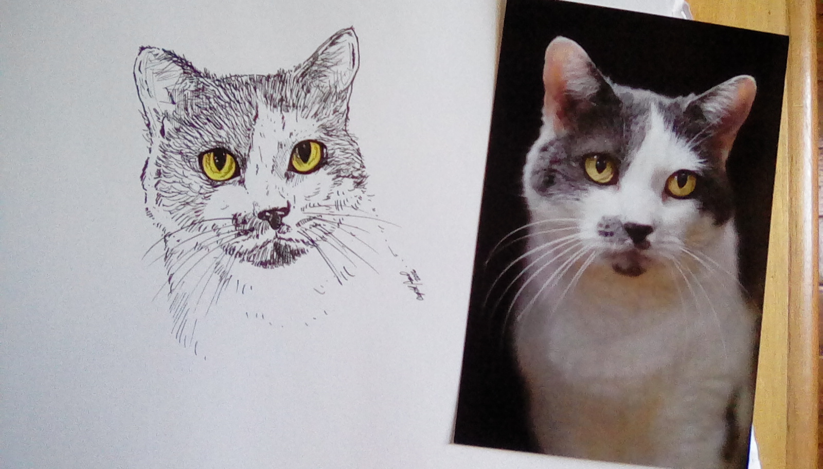 Here is an ink drawing of a cat that is up for adoption with the ASPCA. A local nonprofit asked selected artists to create a portrait of an animal available for adoption. Whomever adopts this gray and white feline will also get a portrait of the same animal. Here I drew the cat in ink, using Micron black pen. I used Prismacolor colored pencils to add color to the eyes. I may add a bit more ink for detail,but overall this piece is done and it needs to get to the gallery to be in display with the other works. Enjoy!