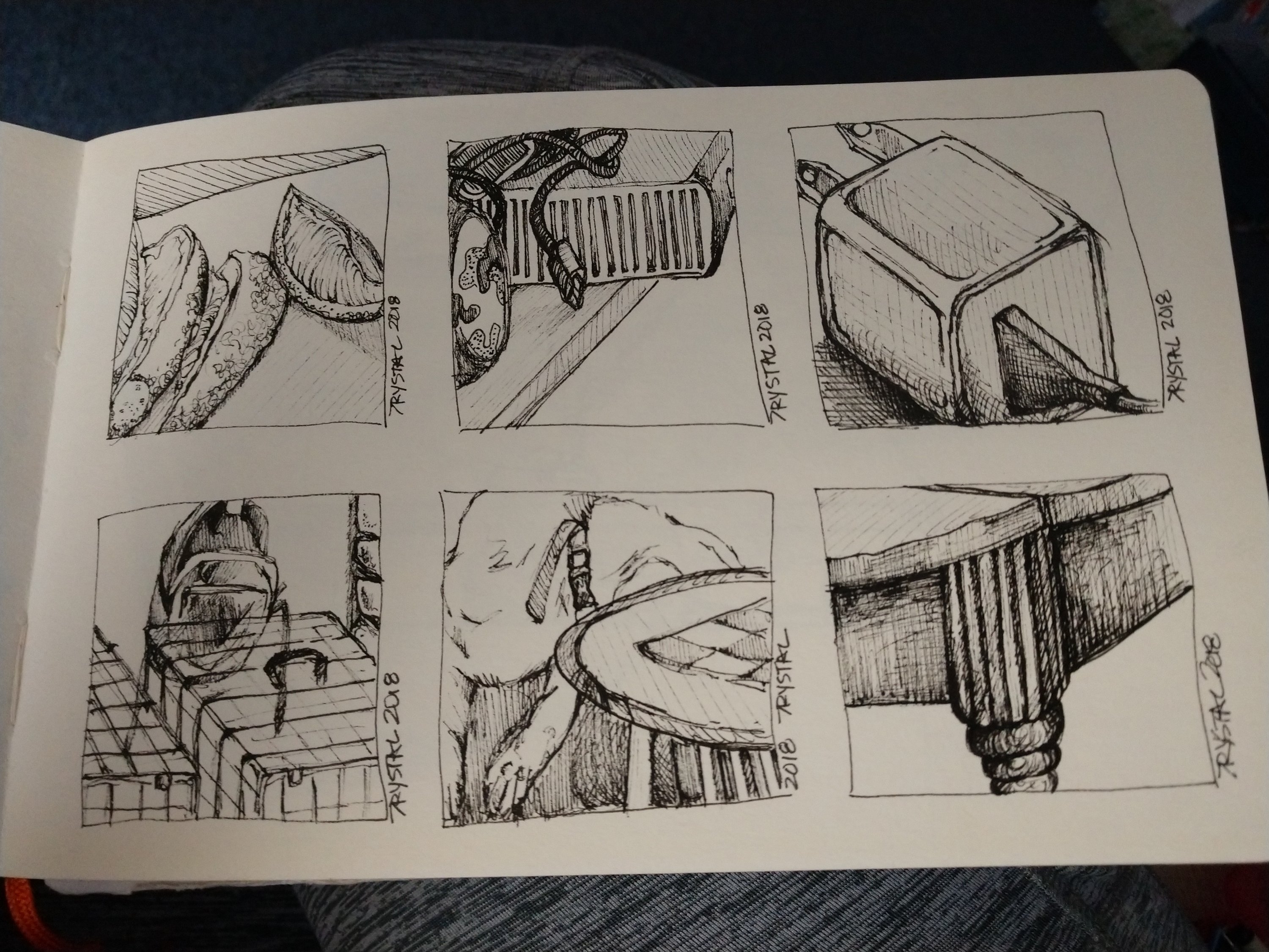 Sometimes the presence of a blank page can be daunting as hell. Breaking it up into small “thumbnail” squares somehow makes the task more approachable. It’s also fun to catch just a snippet of what you see inside a little box. It’s quick, it’s satisfying, and it doesn’t need to be perfect. You can cover a lot of ground, fill a lot of squares with a variety of perspectives. Sketch in a square while waiting at the doctor’s, while on hold on the phone, while the dinner cooks. There’s no excuse not to fit in a little drawing a day.