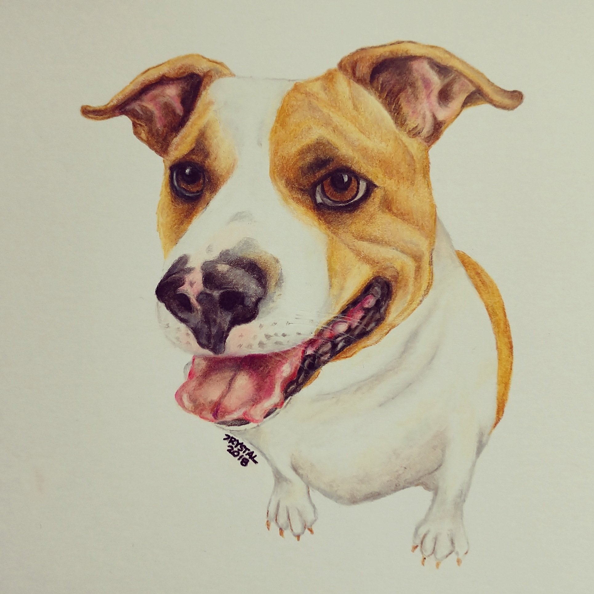 Meet Spirit! A beautiful Pitt mix I’ve just finished drawing. This commissioned piece took me about five hours to complete. I used Prismacolor colored pencils on Strathmore Bristol board.