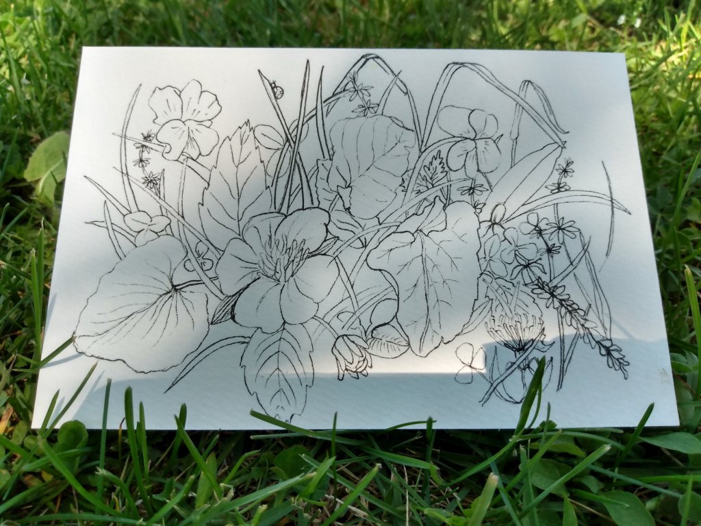 The weather has been so beautiful this past week that I took to drawing the little treasures popping up everywhere. This line drawing was done using Micron black pen on Canson watercolor paper. I will be adding watercolor this coming week, and then this postcard will be up in my Etsy shop!